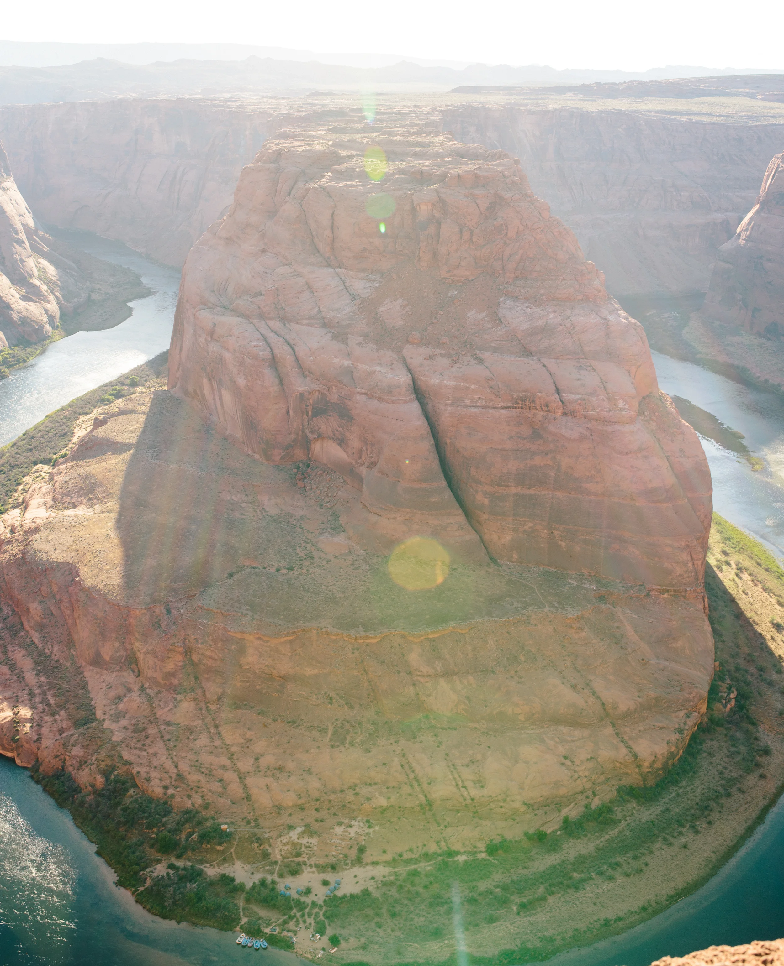 Never have I ever seen a drop like this. Ever. Thousands of feet down—straight down—we see what resembles ripples at the water’s edge. But they’re not ripples—they’re boats. White water rafters exploring the Colorado River set up camp for the night at the base of the bend, and their minuscule size magnified the staggering reality of the scene. It’s a long way down; let’s just stick with that.